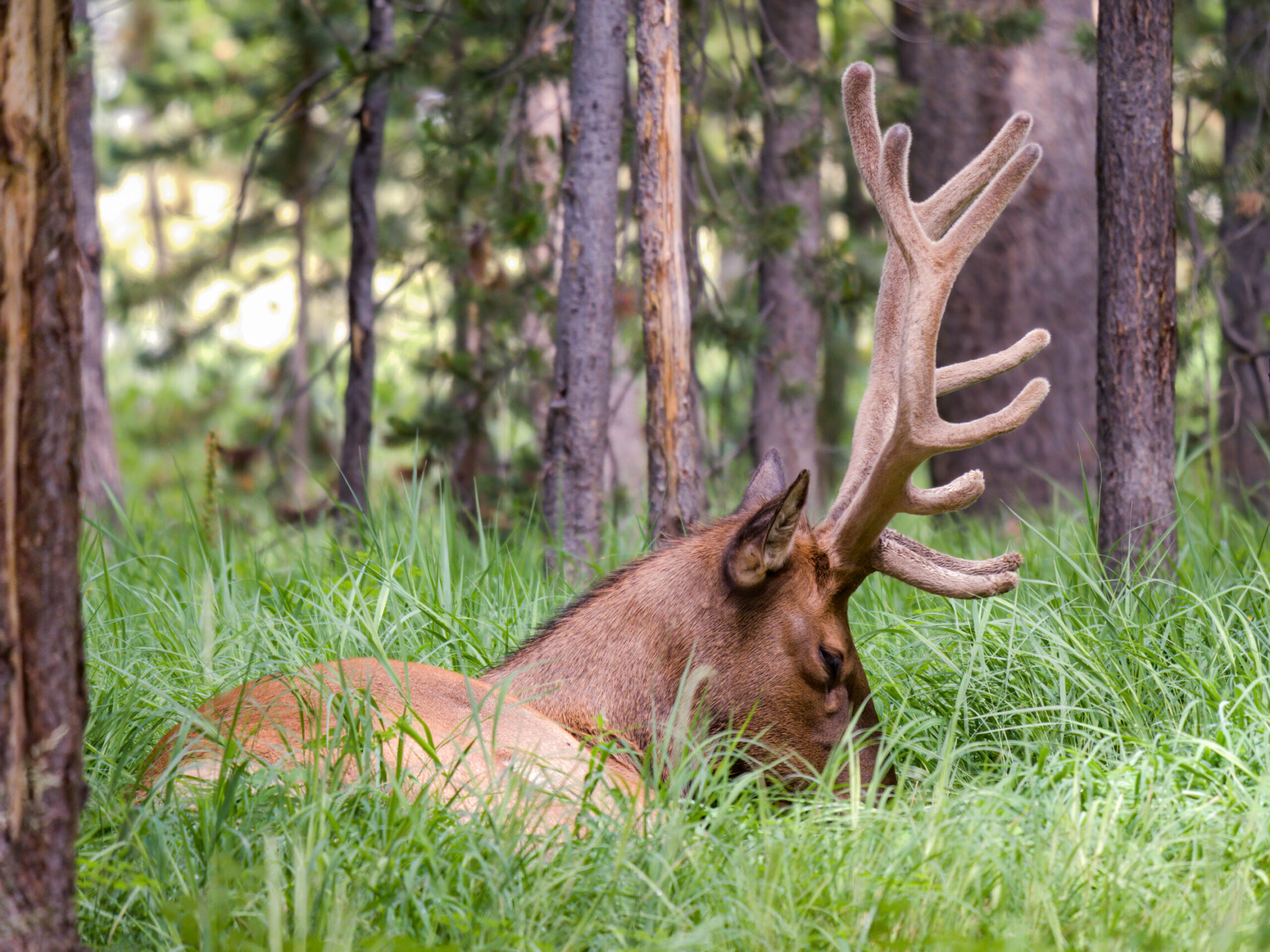 (Above) A sleepy Elk, laying down for a midday nap on a bed of grass.
