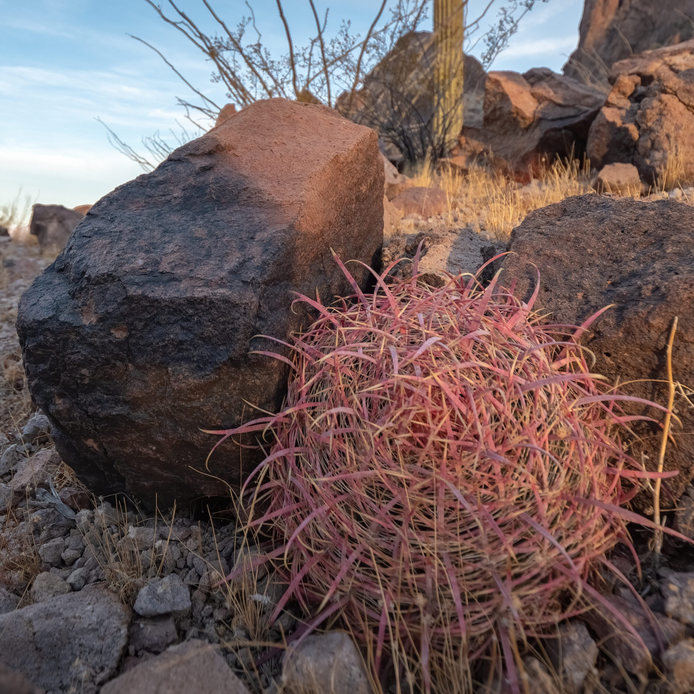 Another interesting find was this dead cactus. When a Barrel Cactus dies, the inside rots away but an outer layer of spines remains intact, resembling a woven basket.