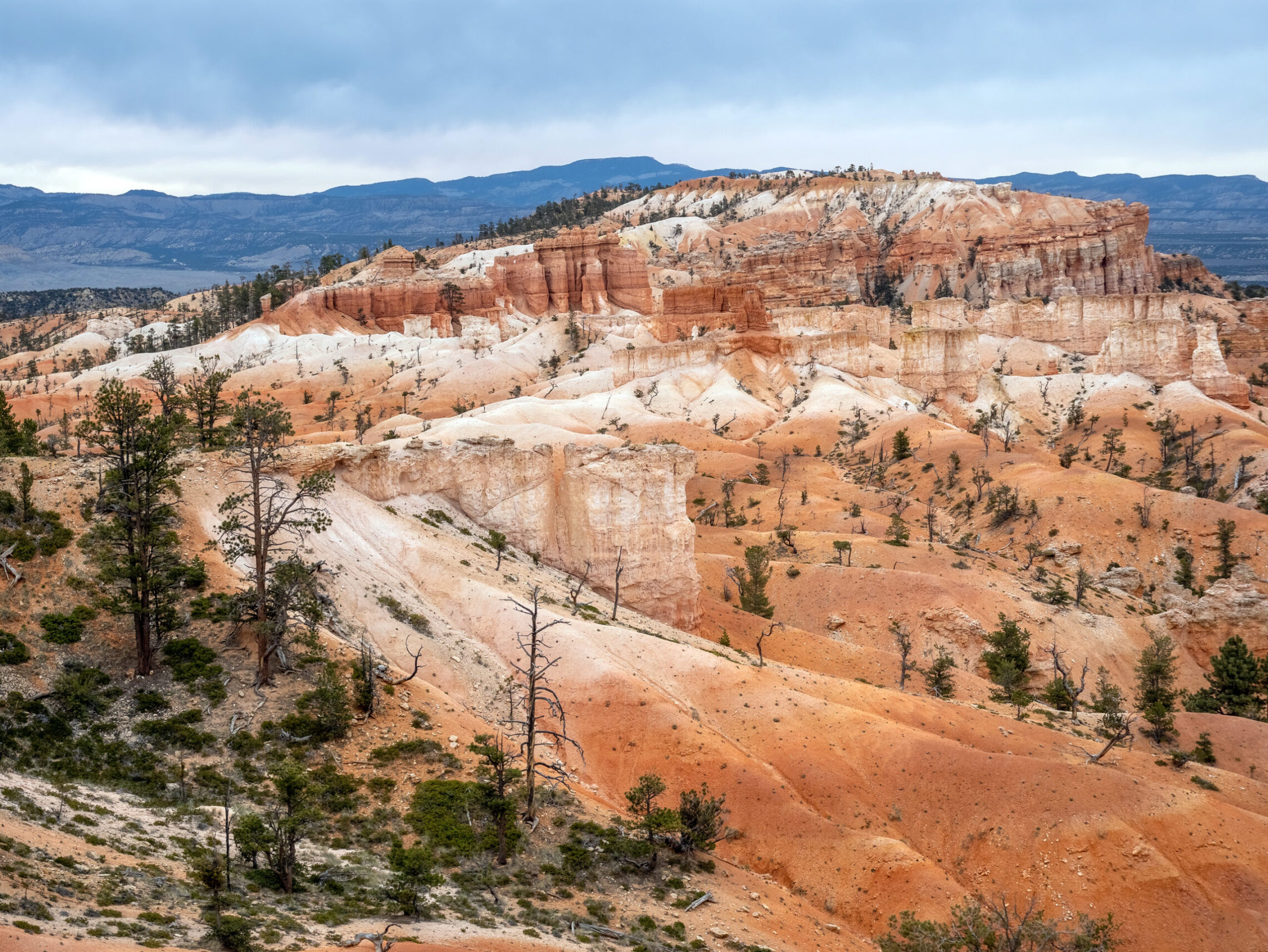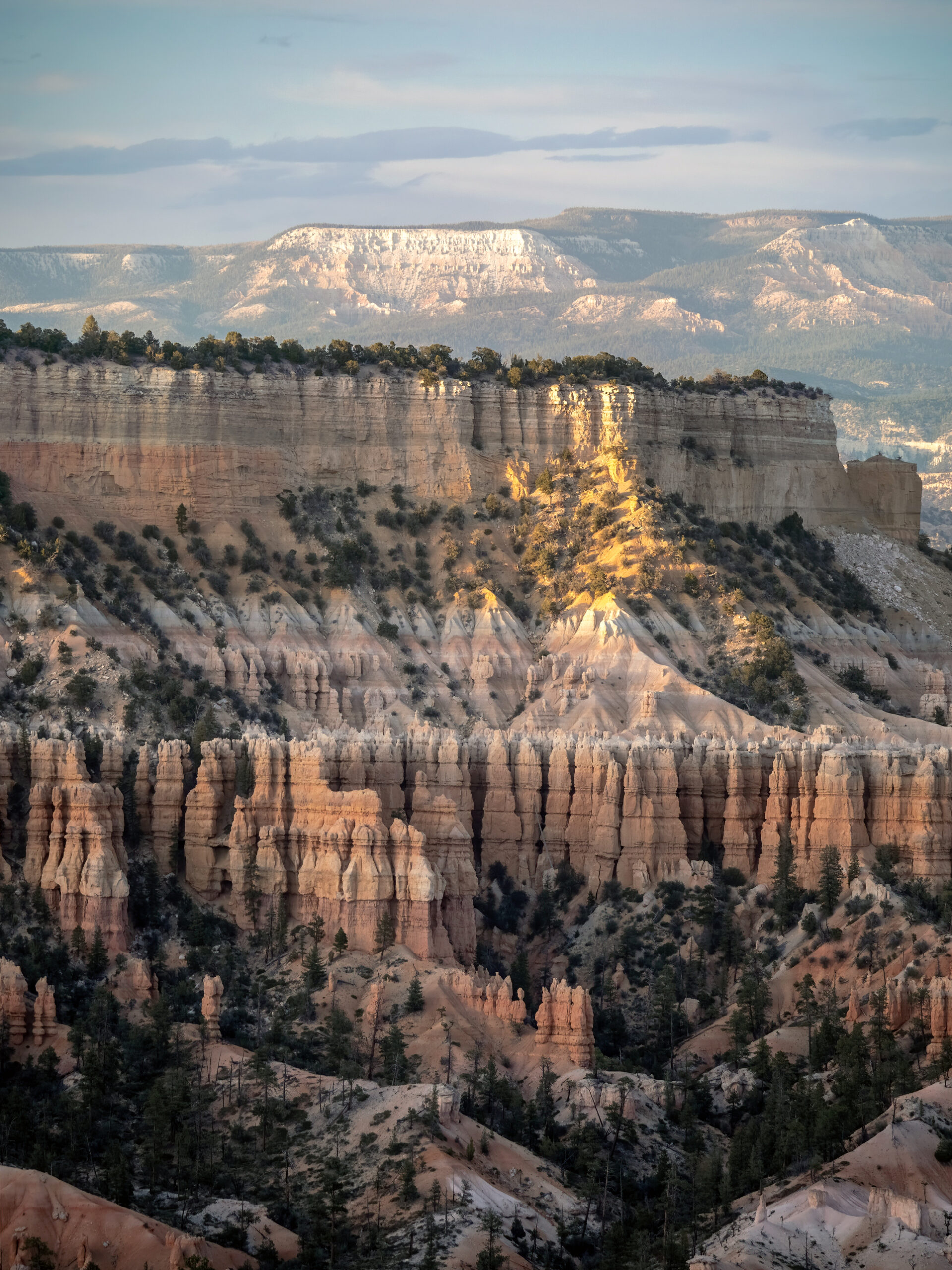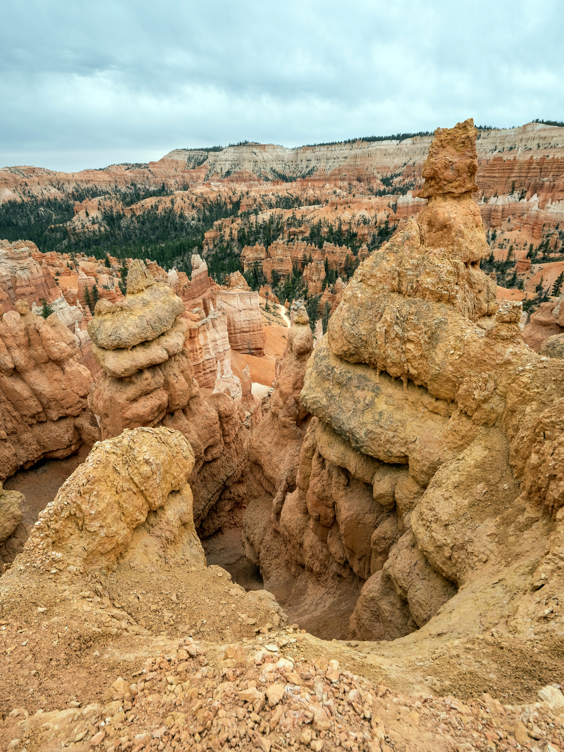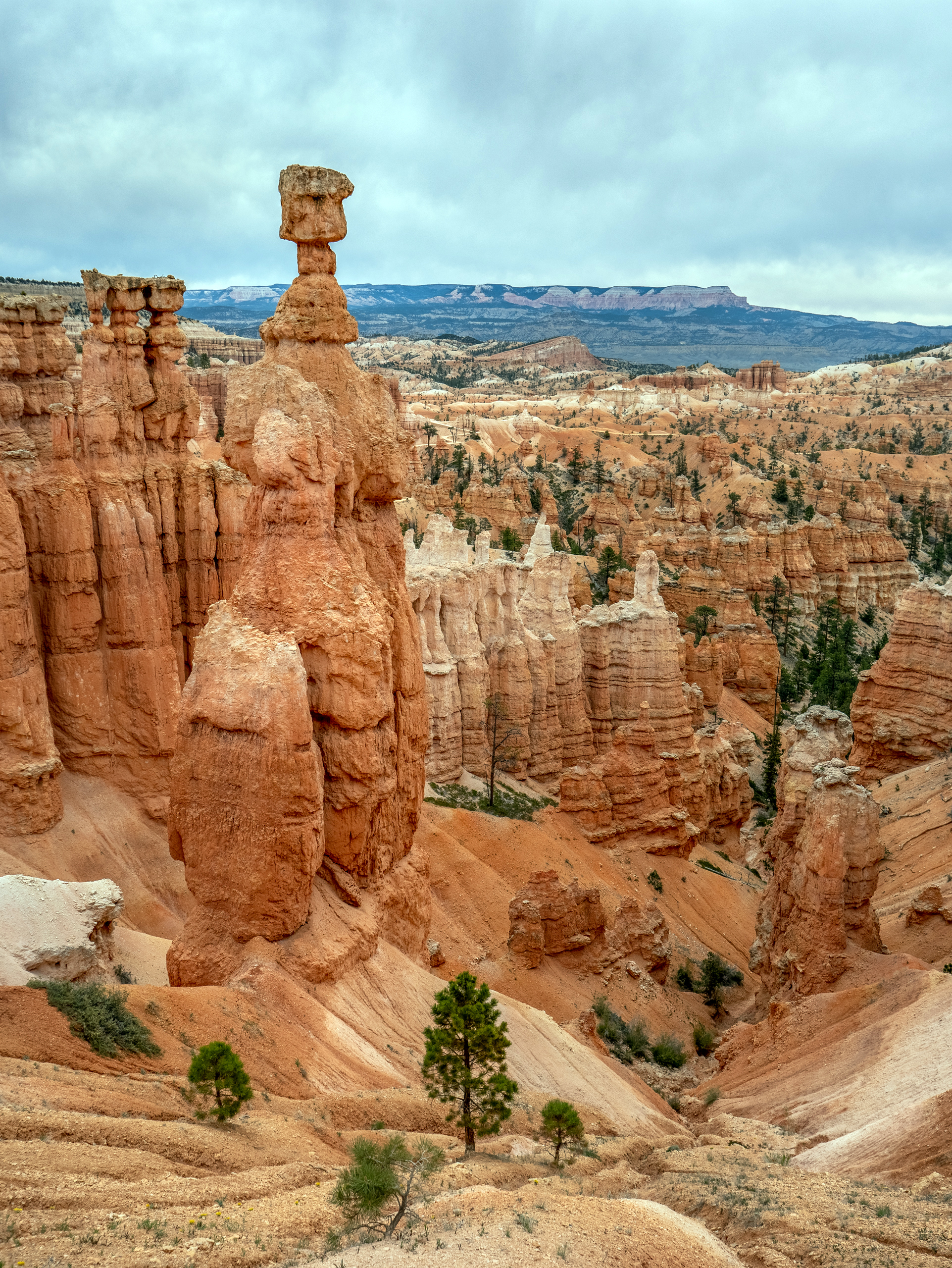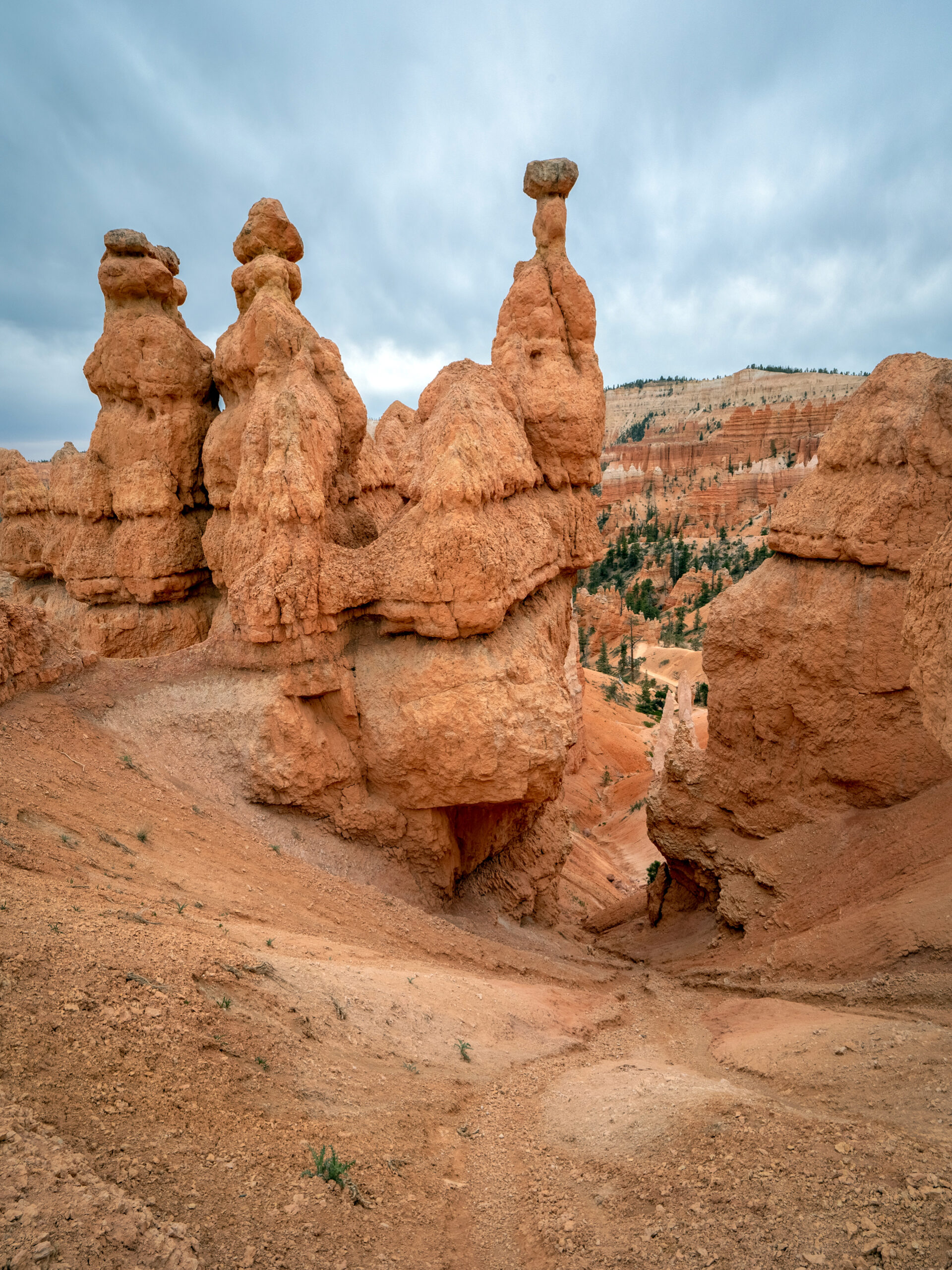 Day 3 started with sunrise along the rim of the amphitheater, somewhere between Sunset and Inspiration Point. Although it was cloudy this morning, and the sun was never actually visible due to the clouds, it created an lengthy pallet of colors upon the belly of the clouds right before what would have been the sunrise, before rising and hiding behind the clouds for the remainder of the morning.