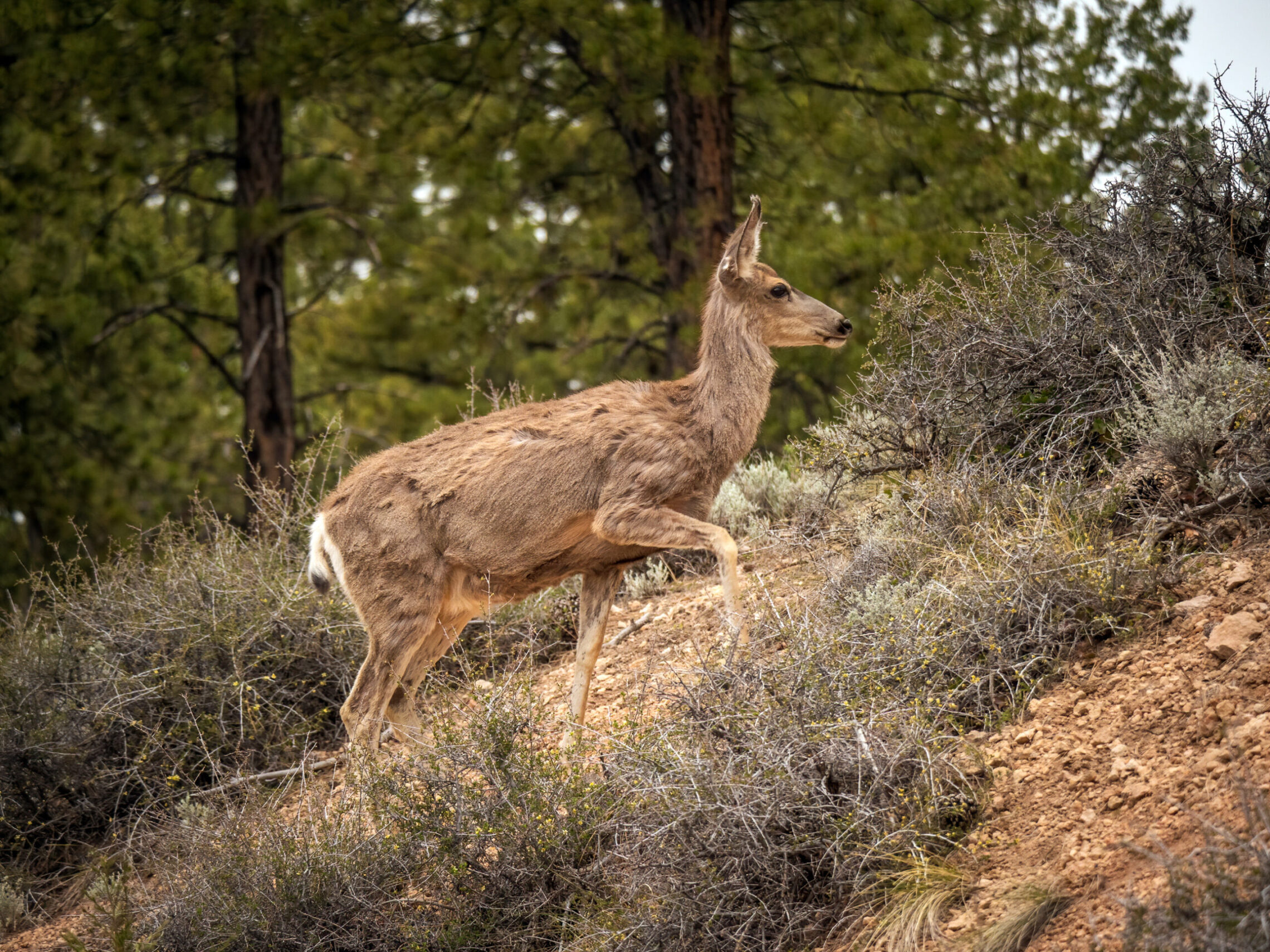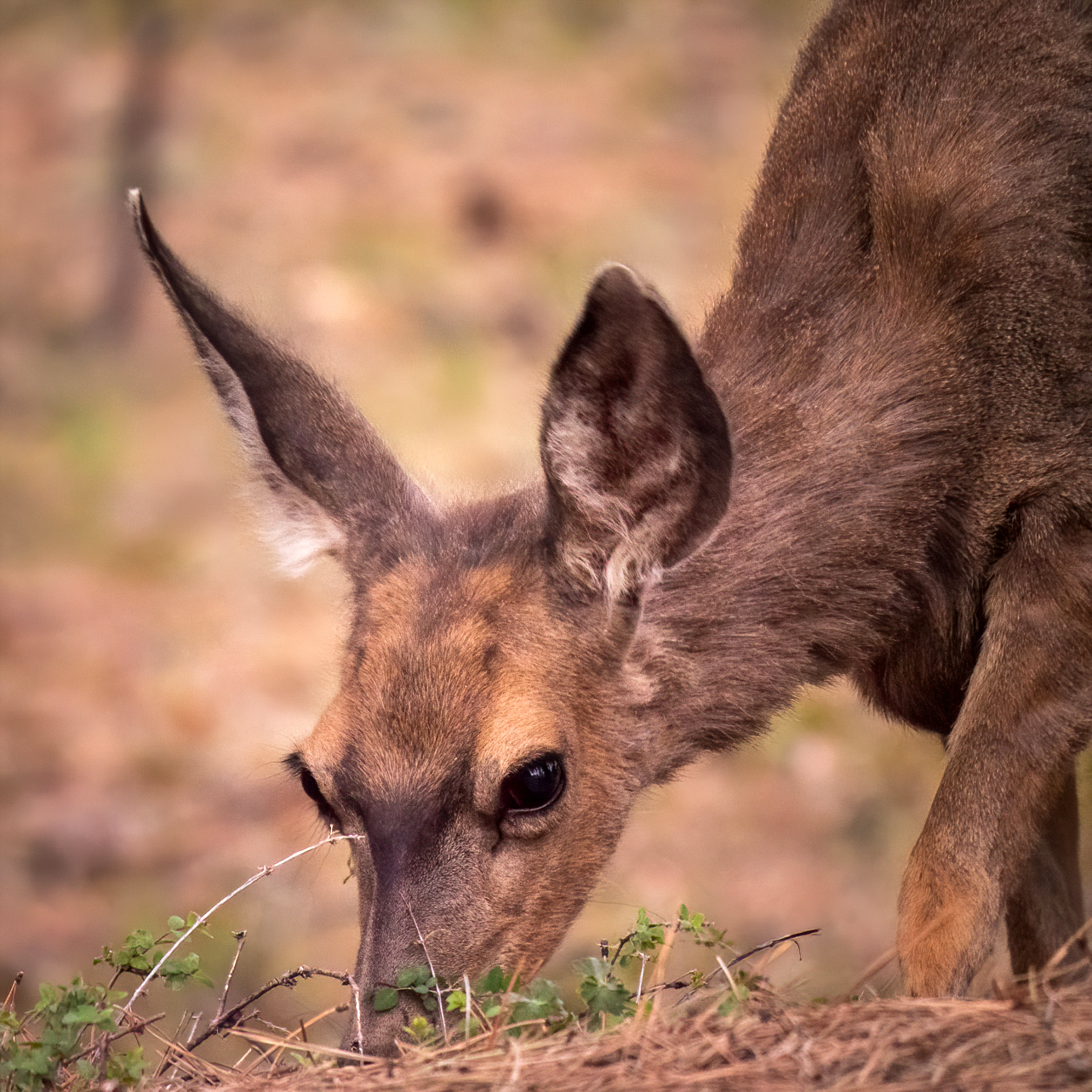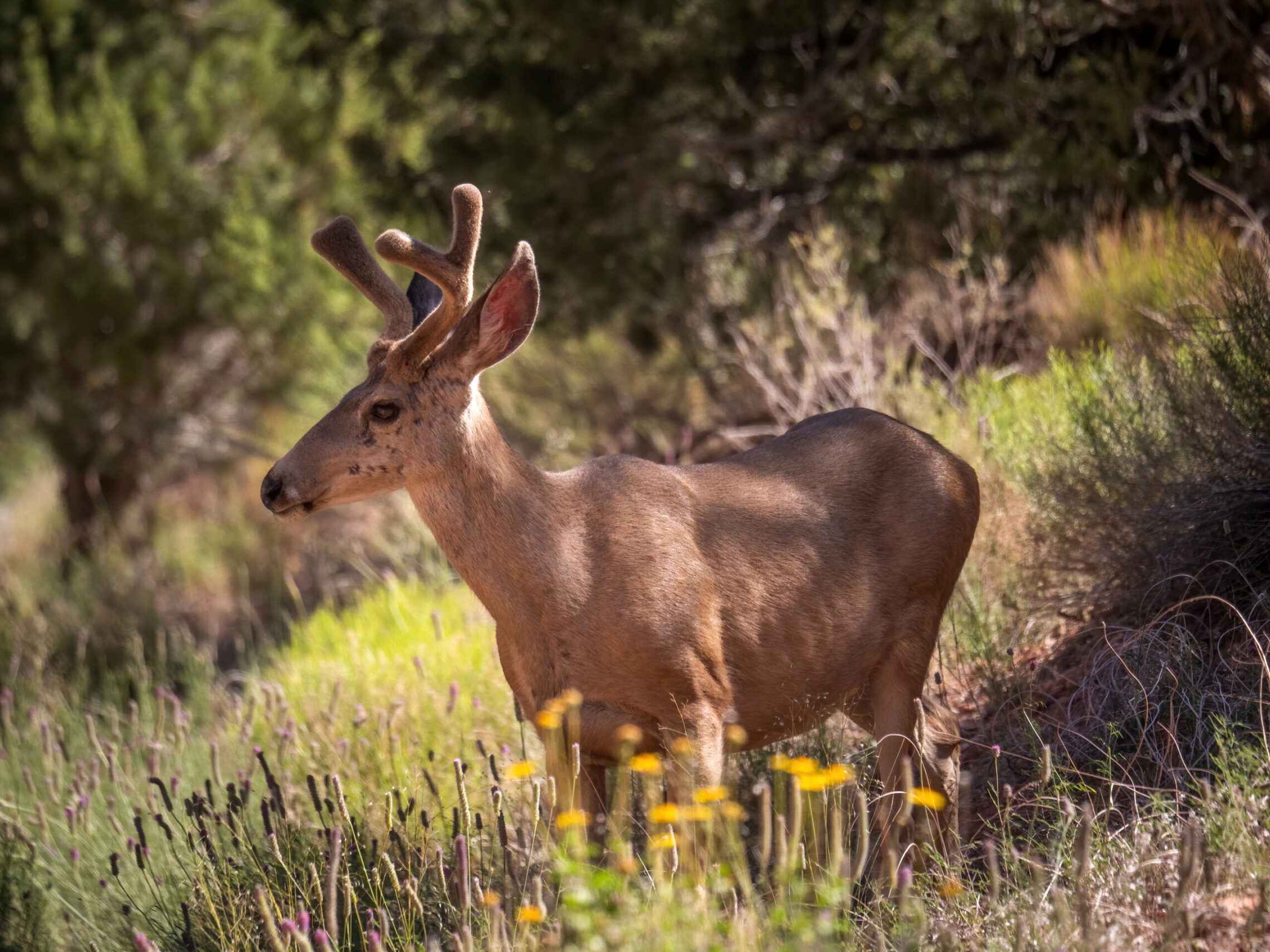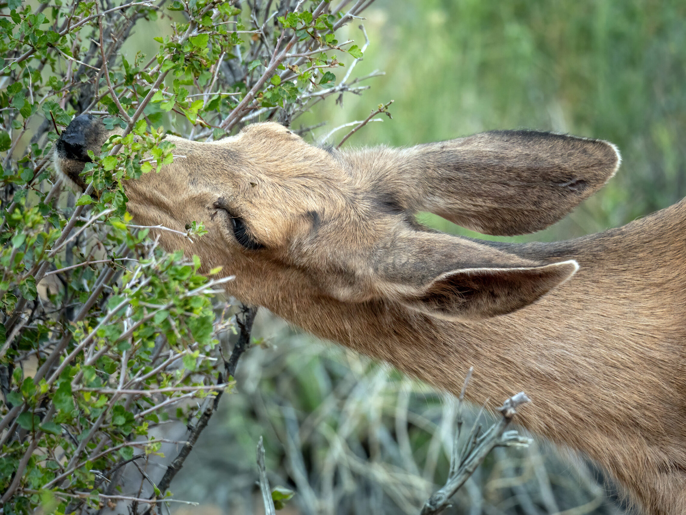 After the sun had set behind the walls of the canyon, I passed by a mule deer having an evening meal.