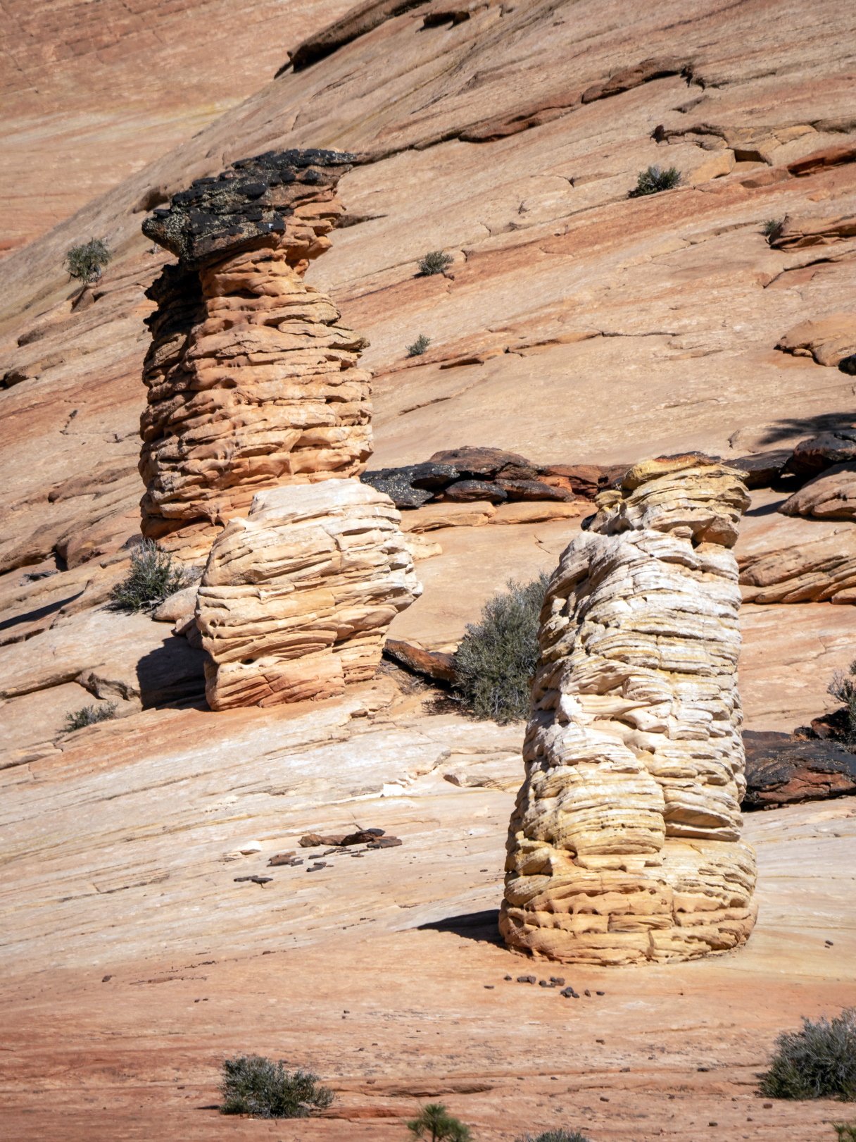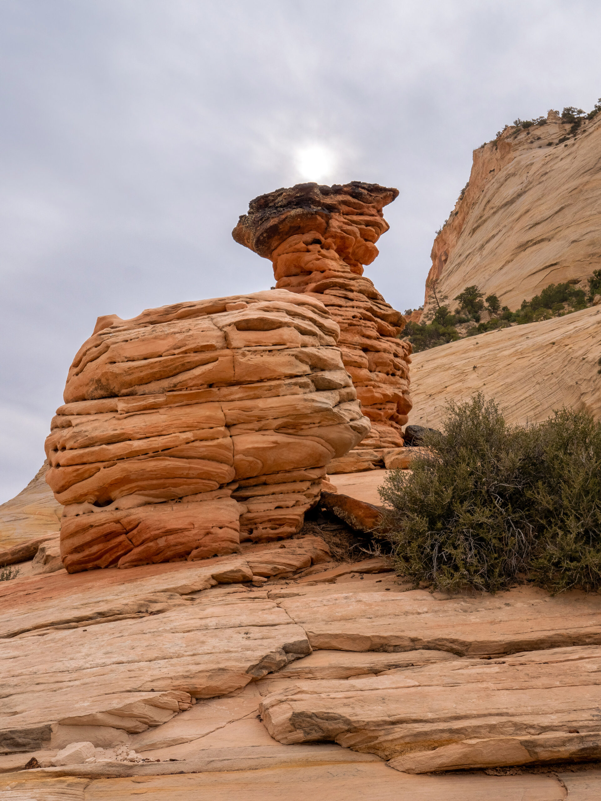 I then continued to the east side of the park, where I explored the area around the Checkerboard Mesa. The checkerboard pattern is caused by a combination of cross-bedding (the ripple lines of an ancient sand dune), which resulted in the horizontal lines. Then contraction and expansion due to temperature and moistures changes in the sandstone lead to the vertical lines, leading to the checkerboard pattern seen today.