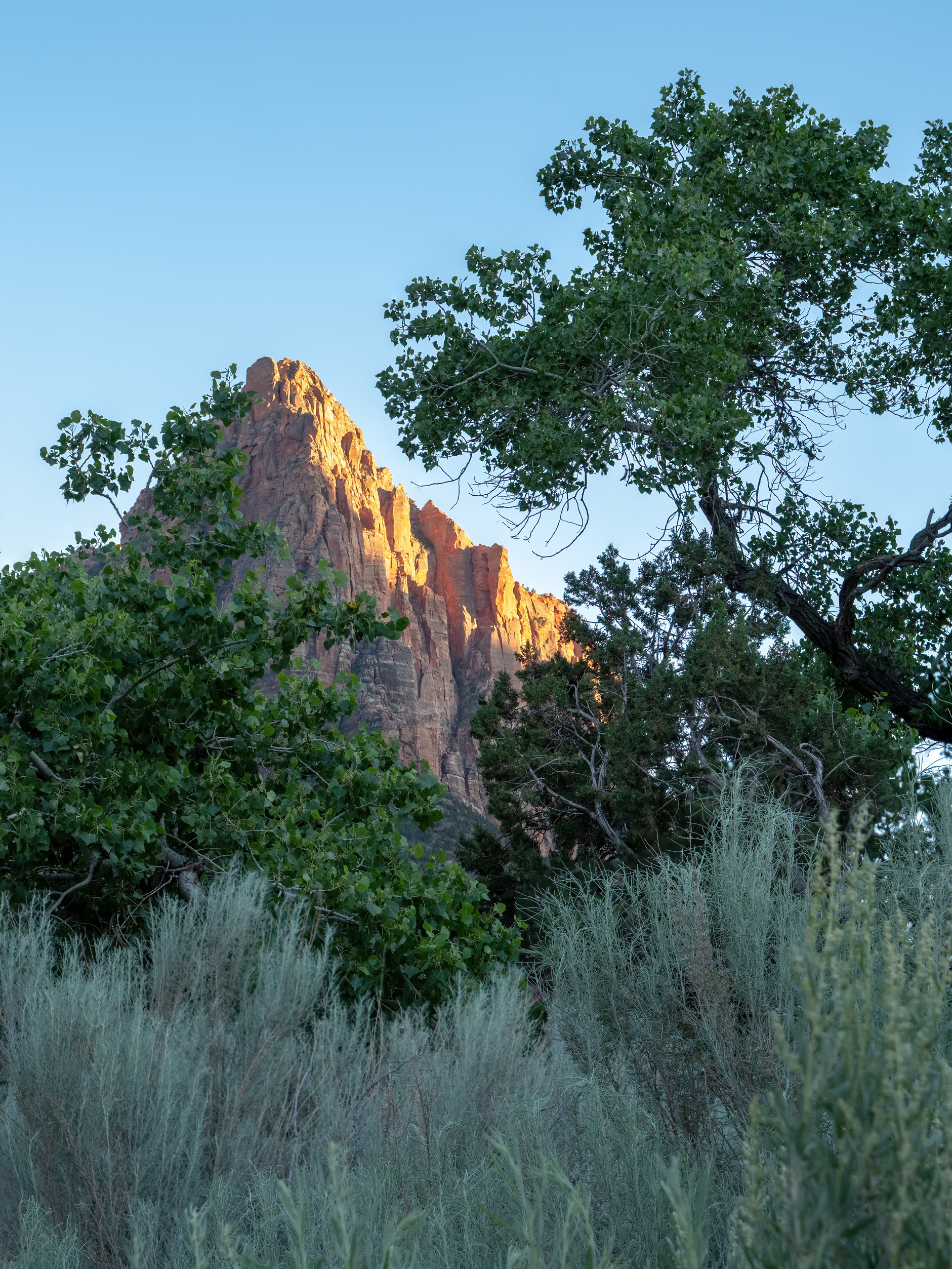 Day 5 ended with taking a stroll down the Pa’rus Trail, and trying to find a unique way to photograph the Watchman. in a way that was outside of the standard observation points and known photo locations. I found a window in between a bush and a tree, which framed out the last light of the day landing upon the red Navajo sandstone.
