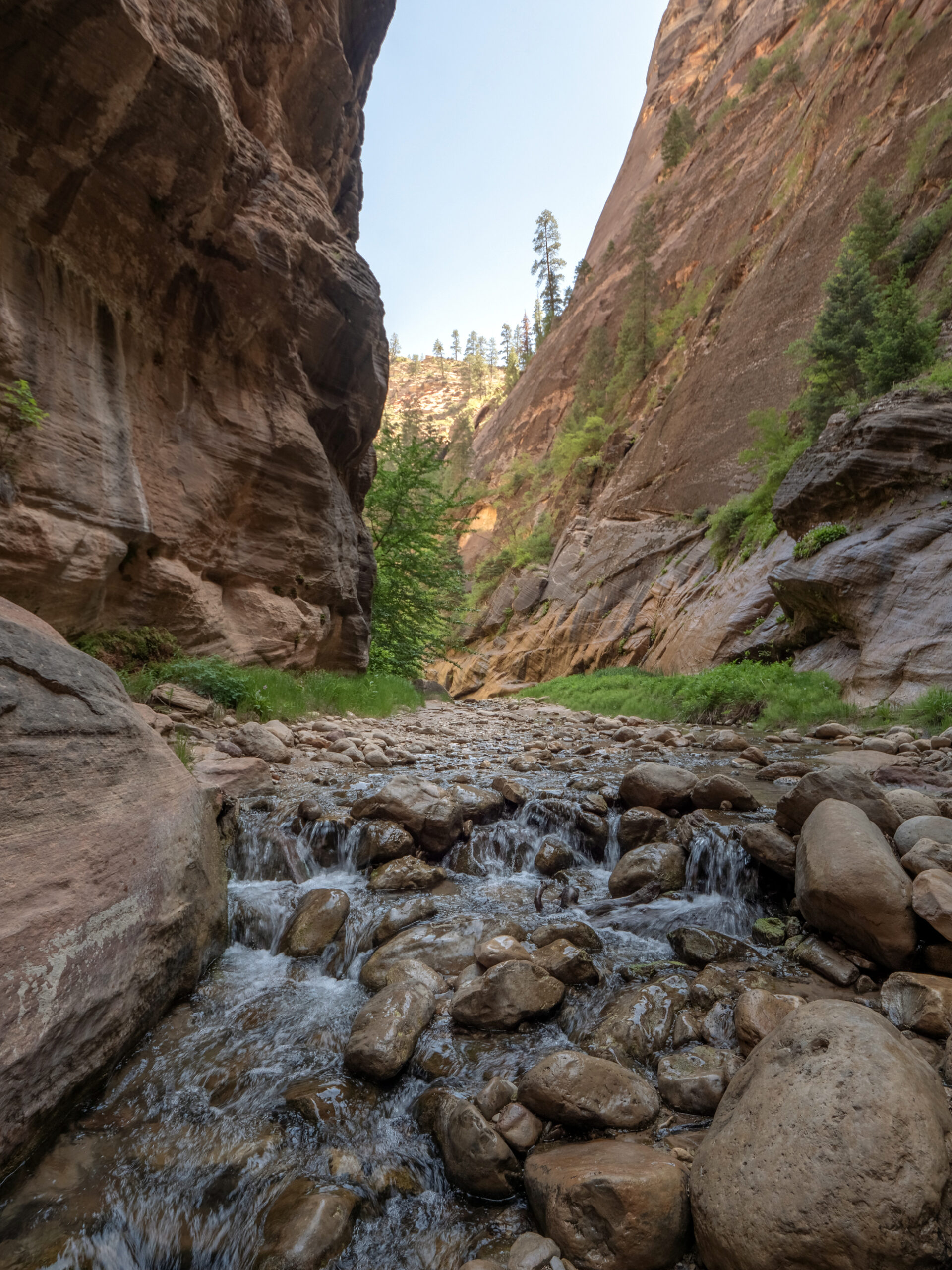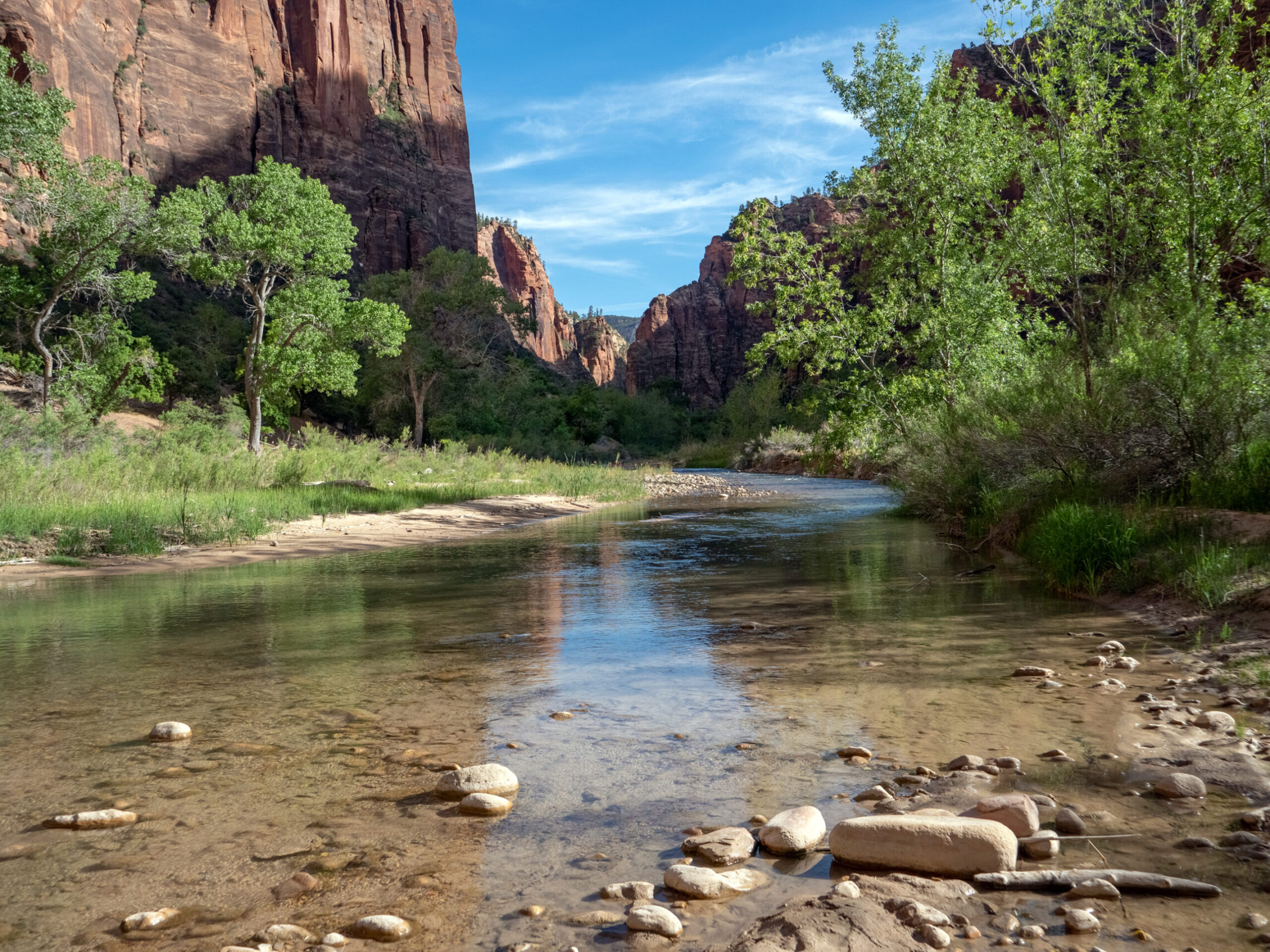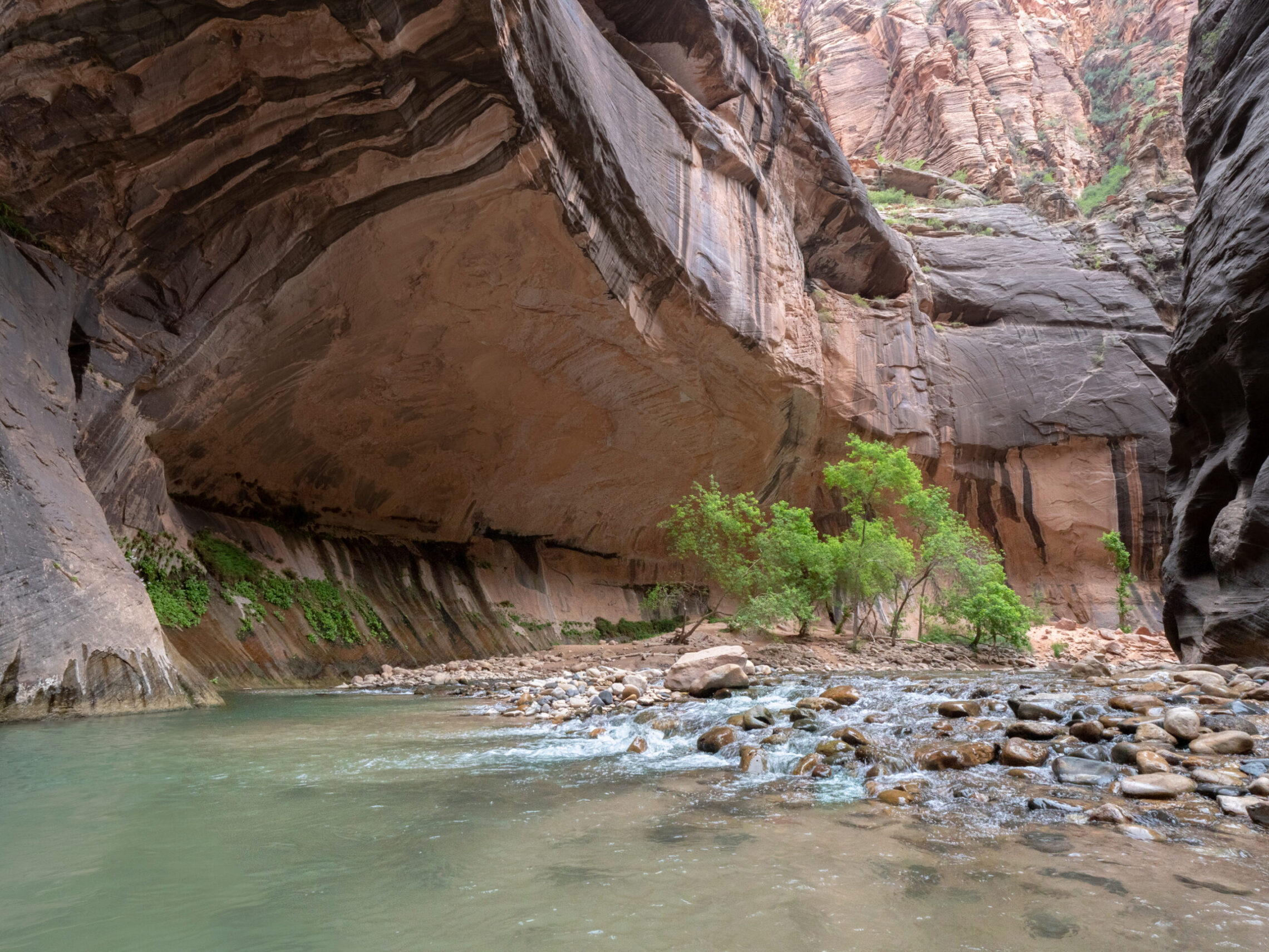 Day 7 I hiked down the Narrows, which is the section of Zion Canyon which is narrower than any other part. The walls reach 1000 feet tall, and the river inside this gorge can be just around 20 feet wide at times. The hike itself takes place in the river directly, where you are walking for miles in various depths of water. Most of the hike was under knee-height, but there were parts which extended as high as my chest. Something to think about while making this hike is the possibility of flash flooding, and the weather forecast must be carefully looked at before starting the hike. Storms even many miles away can affect the water levels in the Narrows, and a flash flood can occur with almost no warning given the right circumstances. So make sure there is almost no risk of this occurring before taking this hike, as there are many areas with absolutely no escape due to the high and steep walls surrounding the river. But, if it is a safe day to do so, this hike is incredibly unique and an amazing experience.
